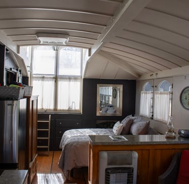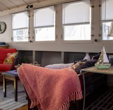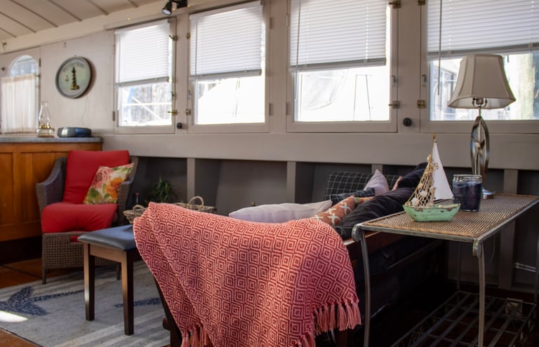When they tied up to the dock, they found a friendly, quiet marina. This secluded hideaway has been a part of the local community since the early 1700's. Mackey's Marina is a full-service marina. It provides shore power hook-up, fresh water, and waste pump-out. Trained mechanics are available to service or repair both diesel and gas marine engines. The knowledgeable staff can repair your boat. A travel lift is available to pull you out of the water if needed. The best was yet to be discovered. Down the dock, past the canopy where all are welcome and local boat owners gather to throw meat on the grill, share a strong drink, and regale in tall tales, there is a 41 foot houseboat Airbnb where quiet and comfort abound.