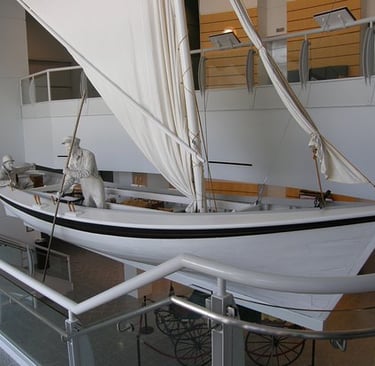 The Shad Boat became an iconic symbol of Eastern NC's maritime culture and the lives of watermen. Its innovative features and construction influenced later boat designs. Originally built from native Atlantic white cedar (juniper), utilizing roots and stumps for curved frames, making them lightweight and rot-resistant. Early designs had a round bottom for stability in choppy waves, a deep V-bow, and a high stern for nets. The defining feature is its keel, built from a hollowed-out log or root (often white cedar), which is then planked with frames, creating a strong, distinctive shape unlike conventional boats. It functions like a flats boat in shallows but can handle rougher conditions in open bays, a rare combination. Unlike deep-V boats designed for offshore chop, the shad boat excels in shallow, protected sounds while still being capable of handling wind shifts and waves. Its construction blends traditional dugout-style keels with plank-on-frame, a unique "intellectual leap" by creator George Washington Creef, setting it apart from mass-produced designs. The Shad Boat was originally powered by three sails (main, jib, topsail), offering great control and power across a wide range of wind conditions; later versions added a V-bottom for engines.
