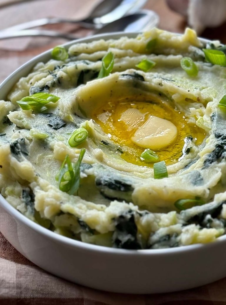 My fondness for cabbage often connects me to an Irish culinary tradition. The name colcannon is derived from the Gaelic “Cal Ceannann,” meaning "White-headed Cabbage." The earliest written reference comes from an account by William Bulkeley in Dublin in 1735, describing colcannon as a hearty mix of cabbage, potatoes, and parsnips, commonly enjoyed during Halloween festivities. Part of the tradition included placing tokens in the dish to predict fortunes—a ring signaling marriage, a coin indicating future wealth, and a rag or stick hinting at either poverty or a harsh spouse. A central well often cradled butter or an egg, which would be stirred in for good luck just before serving.