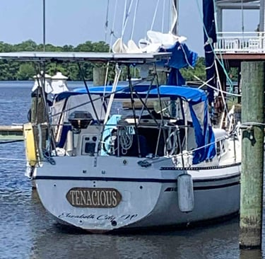 The steel rod that the doctors had to insert in Steve's neck put an end to his bike-riding days. What was Steve going to do now? He loved riding his bike. He loved the challenge and the adventure of a long-distance trek, but riding his beloved bike was no longer an option. In the very spirit of sheer determination, and despite his daughter, Sarah's, objections, Steve decided to buy a sailboat and learn to sail. Over the last four years, Steve has sailed in 3 Father's Day Regattas, cruised to Plymouth to attend the annual Black Bear Festival, sailed to Wanchese and Ocracoke, and conducted a "Pub Crawl" for Mackey's Marina that included many destinations around the Albemarle Sound.