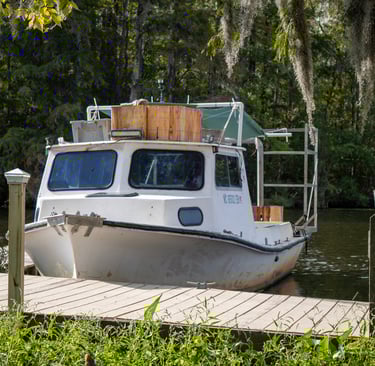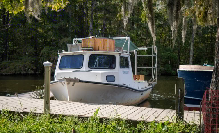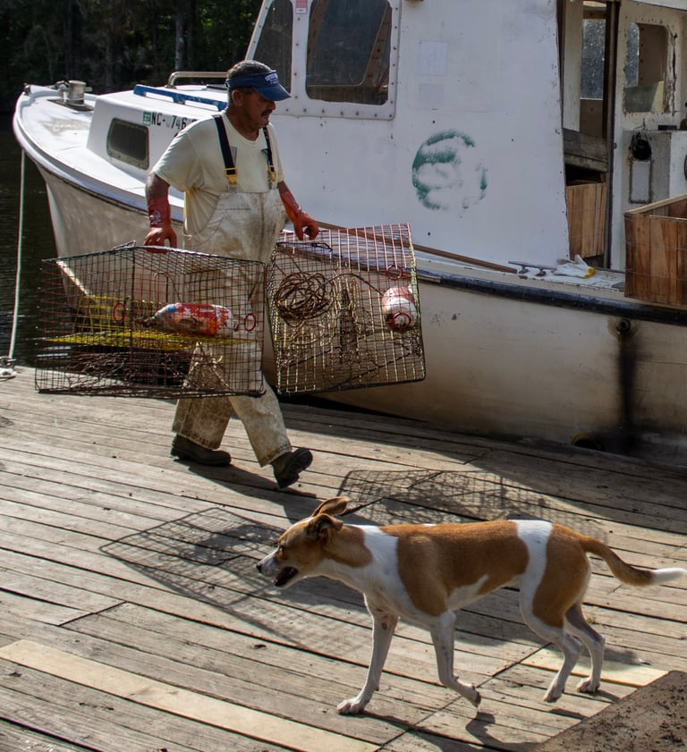 In the darkness just before dawn, a crab boat Captain checks the oil level in the diesel motor that will soon ferry him and a crewman out onto the Albemarle Sound. The Captain scans the sky one last time and then fires up the engine. The crewman loosens the dock lines and slips nimbly aboard the crab boat as the Captain eases the boat into gear and points the bow downriver.