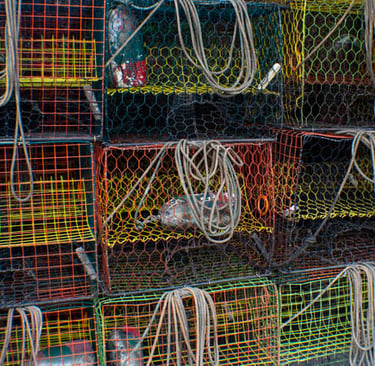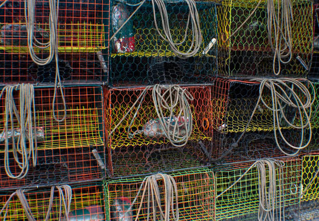 The Captain scans his depthfinder intently, searching for just the right spot to drop his line of crab pots. He gently slows the boat as they approach the area where the work will begin. One by one, the crewman tosses the baited crab pots over the side. The number of crab pots a fisherman can drop varies, but the pots are usually dropped about 200 meters apart.