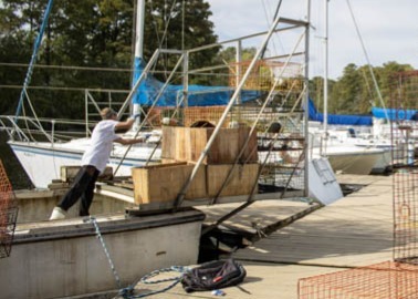 After the fishermen set all the crab pots, it is time to gather the crabs from the pots they put down a few days before. A crewman grabs the line on the crab pot buoy with a hook and quickly wraps the line around a wench. A foot pedal activates the wench, lifting the crab pot from the bottom. When the crab pot reaches the gunwale of the boat, the crewman grabs the pot and swings it aboard the boat. The crabs must be sorted quickly and thrown into crates, and then the empty crabpot is stacked out of the way. The crewman must be quick and be ready to retrieve the next crab pot by the time the Captain has brought the boat to the next buoy. When all the crabpots have been emptied, the Captain brings the boat back upriver to the dock, where the men unload their catch, wash down the boat, and refuel for the next day.